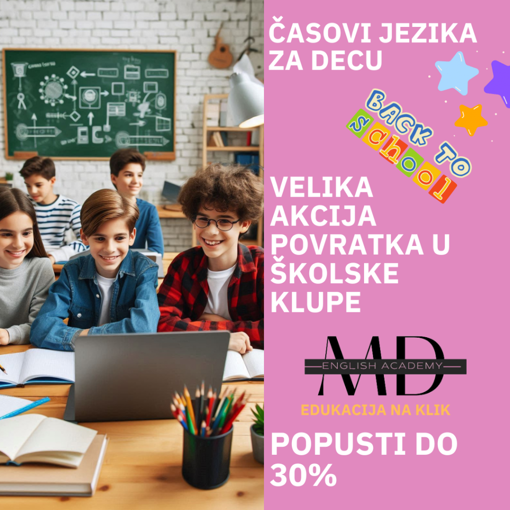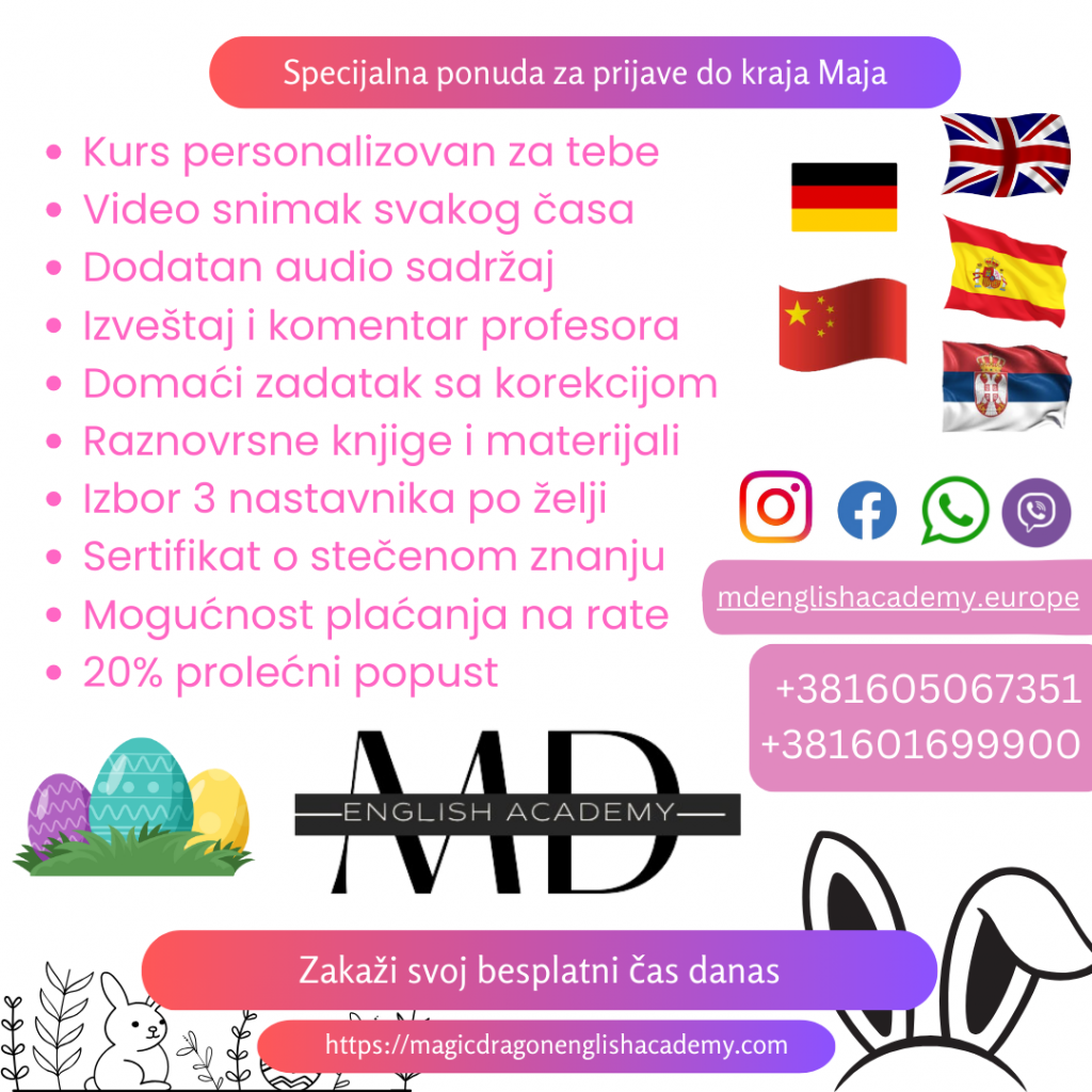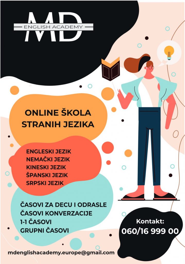 MD Akademija je jezička akademija koja nudi časove Engleskog, Nemačkog, Srpskog i Kineskog jezika deci i odraslima iz komfora svoga doma, bilo kada i bilo gde.