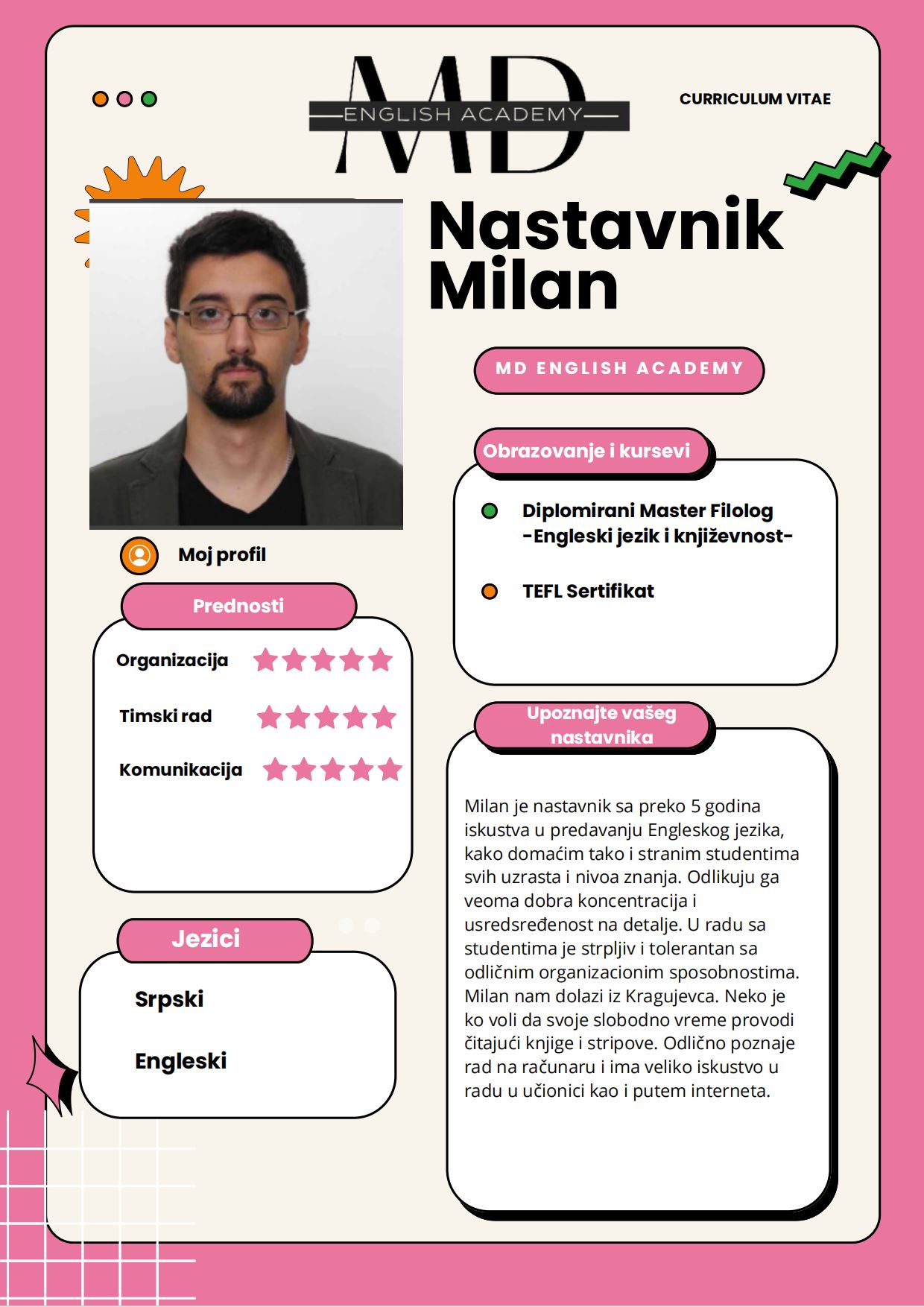 Zoran:”Iskustvo učenja na ovom kursu je bilo izvanredno. Nastavnici su veoma posvećeni pružanju podrške i prilagođavanju nastave individualnim potrebama svakog djaka. Osim toga, imali smo priliku učiti o kulturi jezika, što je dodalo dodatnu dimenziju mom razumevanju i upotrebi Engleskog, kao stranog jezika.”